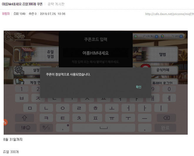 수영복 캐릭터 수집을 노리는 유저를 위해 육군 잡지 HIM에서 새로운 쿠폰을 공개했습니다. 8월 31일까지 쿠폰 페이지에 ‘여름HIM내세요’를 입력하면 300 쥬얼을 지급하죠. 그리고 지난 번 공개한 쿠폰인 ‘HIM내세요’는 7월 31일에 기간 만료될 예정이랍니다.