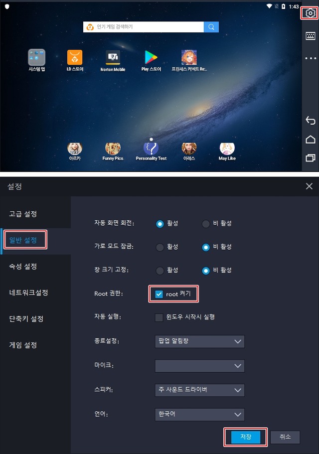 해당 설정탭에서 root 켜기 체크해주시고 저장 클릭 후 재시작 해줍니다.