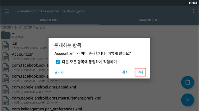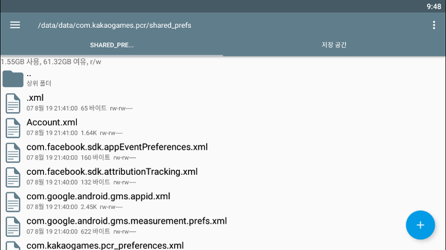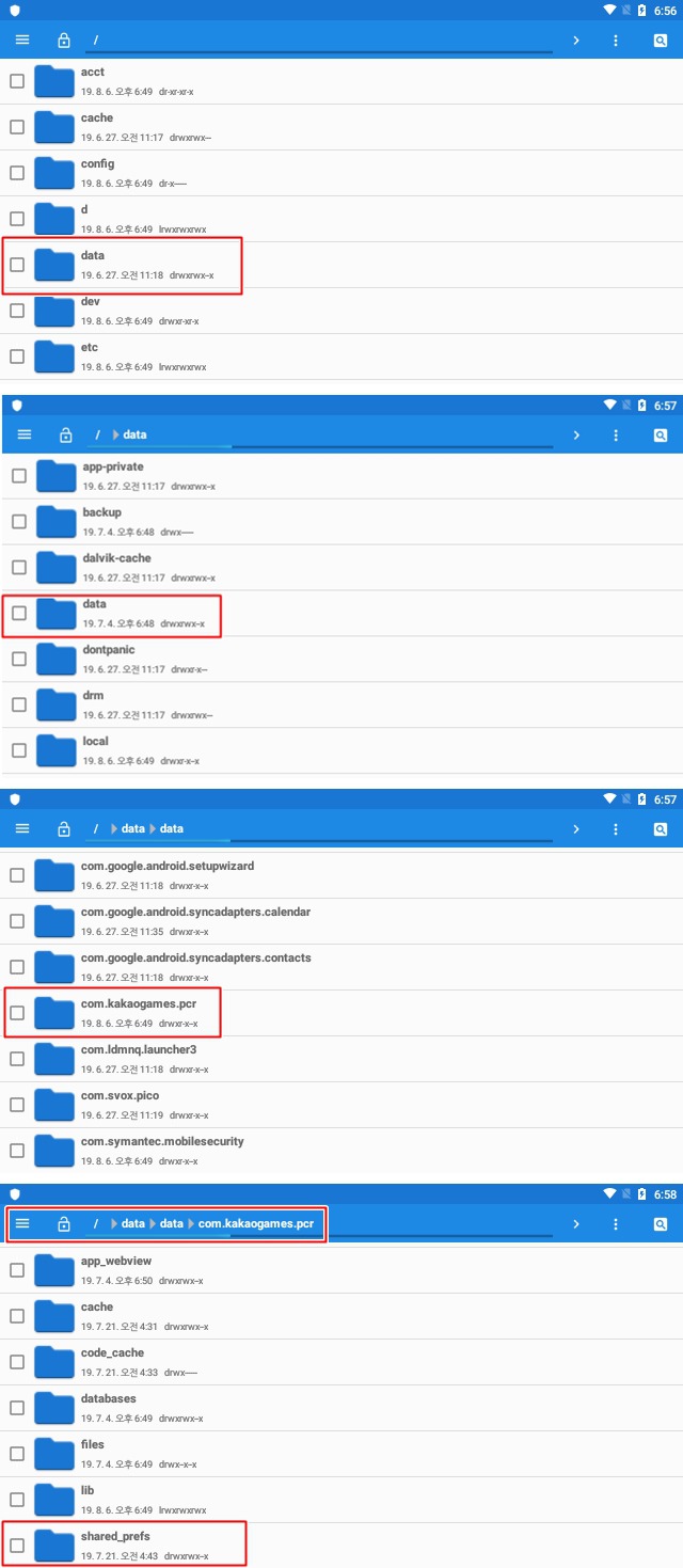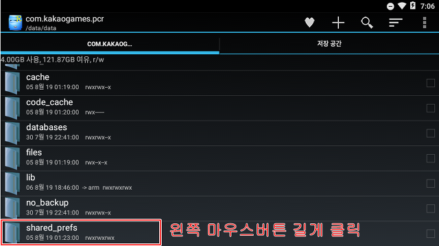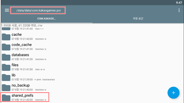 이제 shared_prefs 폴더를 찾아갑니다. 위치는 /data/data/com.kakaogames.pcr 입니다.