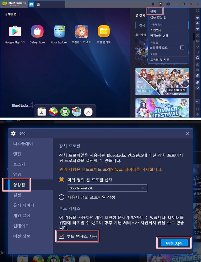 설정에 들어가서 '향상됨'탭에서 루트액세스 사용을 체크 후 변경저장을 눌러줍니다.