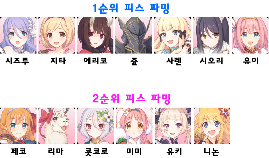 자신에게 필요한 캐릭터가 왜 필요한지 이유를 알고 어느정도 선택해서 키우는 것도 방법이나, 가능한 위에 적은 1,2순위 캐릭은 모두 매일 하드피스를 꾸준히 캐는 것을 추천합니다.