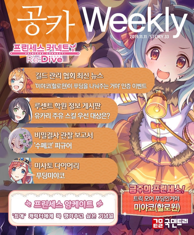 안녕하세요. 당신과 이어지는 애니메이션 RPG ‘프린세스 커넥트 리다이브(이하 프린세스 커넥트)’의 서른 세 번째 공카 위클리 시간입니다. 이번 주 공식 카페는 미야코에 이목이 집중되고 있습니다. 미야코(할로윈) 캐릭터 인증 이벤트가 진행되고 있고, 미야코를 담은 팬아트들이 업로드 되고 있거든요. 더 자세한 내용을 공카 위클리에서 확인해보시죠.