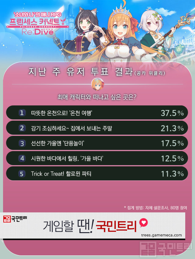 지난주 투표 결과입니다. ‘최애 캐릭터와 떠나고 싶은 곳’이 주제였고, ‘온천 여행’이 1위를 차지했습니다. 따뜻한 온천에서 피로를 녹이고 싶은 바람이 담긴 것 같네요. 다음은 집에서 보내는 주말이 차지했는데요. 급작스럽게 추워진 날씨에 최애 캐릭터가 감기에 걸릴까봐 걱정하는 마음인 듯싶습니다.