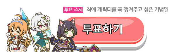 그럼 이제 이번 주 주제를 발표하겠습니다. 연인이나 친구끼리 작은 선물을 주고받으며 소소한 즐거움을 나누는 ‘기념일’들이 있습니다. 대표적으로 사랑을 고백하는 ‘발렌타인 데이’와 연말의 들뜬 분위기를 즐기는 ‘성탄절’이 있는데요. 그럼 여러분이 자신의 ‘최애’ 캐릭터에게 꼭 챙겨주고 싶은 기념일은 무엇인가요? 투표를 부탁하며 결과는 다음 주에 공개하겠습니다.