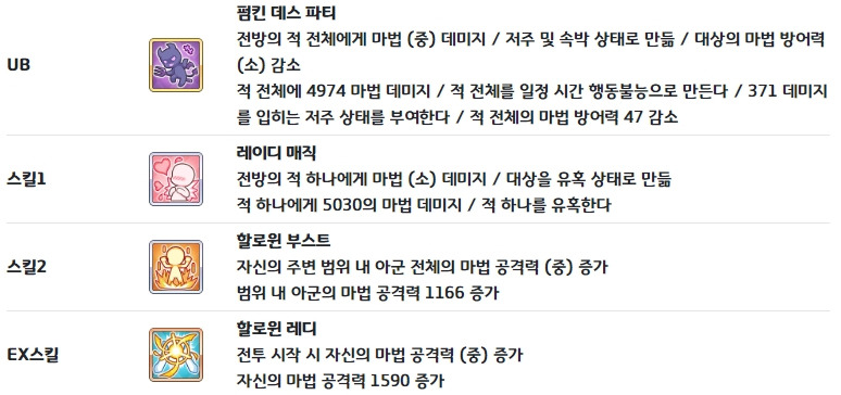 * 저주(12초) : 지속 도트 딜이 들어가는데 매우 체력을 많이 깍기 때문에 UB를 2번 맞으면 적 탱커를 제외하고 전명하게 되는 매우 강력한 지속딜입니다.