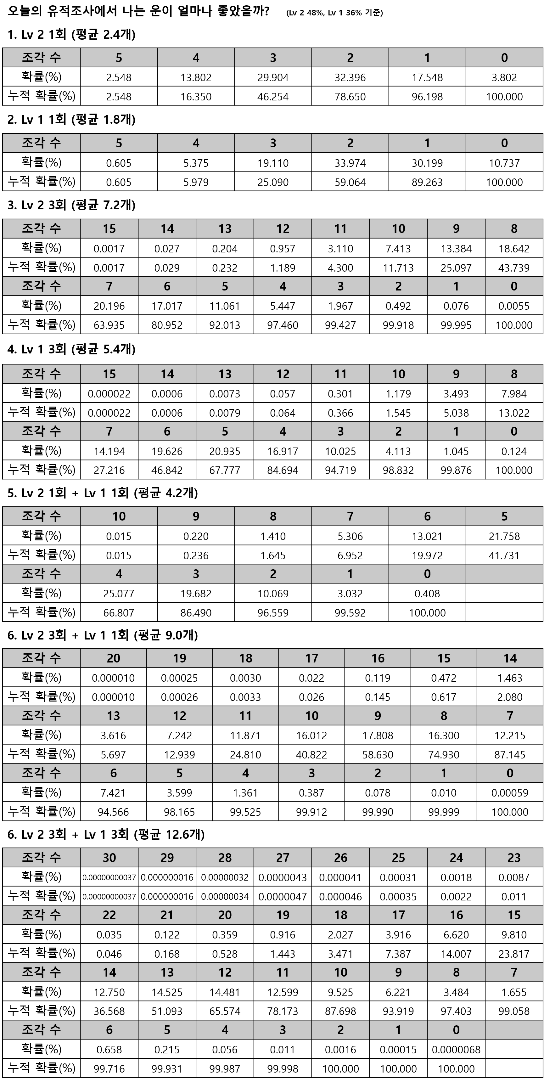 유적조사에서 하트 조각 획득 확률 작성자equi12|작성시간20.03.12|조회수2,199 목록 댓글 2 글자크기 작게가 글자크기 크게가 오늘 얼마나 운이 좋았는지 확인해 볼 수 있게 조각획득 확률을 계산해봤습니다.하츠네노트에 나와있는 조각획득 확률을 기준으로 계산했어요 다음검색 현재 게시글 추가 기능 열기 북마크 공유하기 신고 센터로 신고 댓글 댓글 2 댓글쓰기 답글쓰기 댓글 리스트 작성자스태미나무한 | 작성시간 20.03.12 그냥 안 나오는 날은 드럽게 안 나와 ㅠㅠ 작성자라온카 | 작성시간 20.03.13 하하하하하ㅏㅎ 예상보다 기대치가 높네여 댓글 전체보기