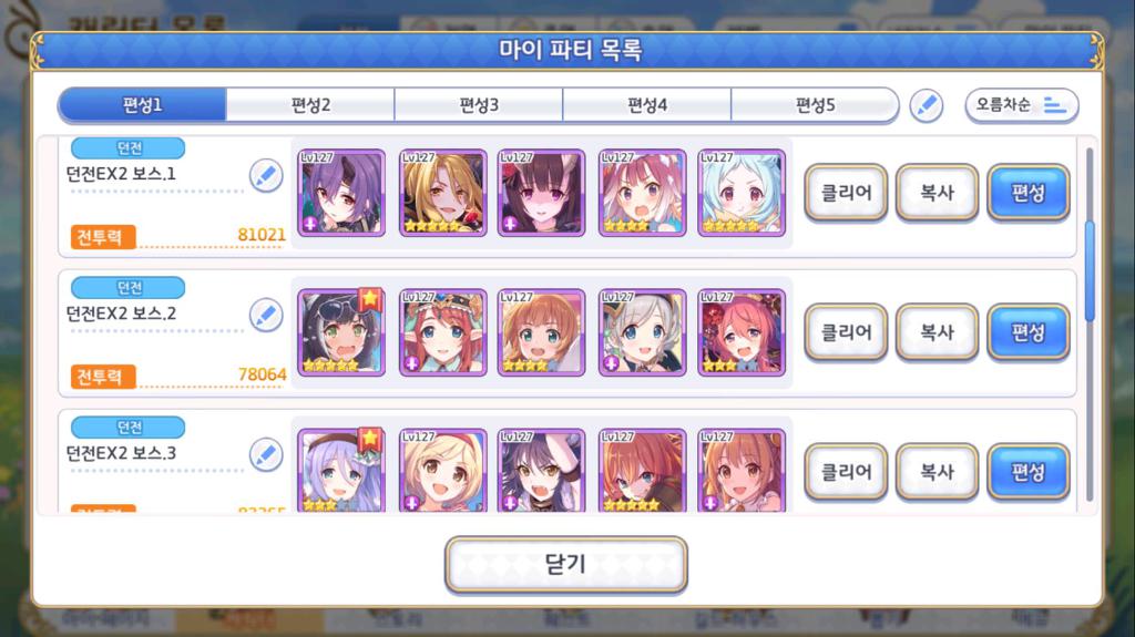 EX2 던전 등반에 사용된 파티 (토모, 시오리 tp 채워가기 오우카는 덤..)