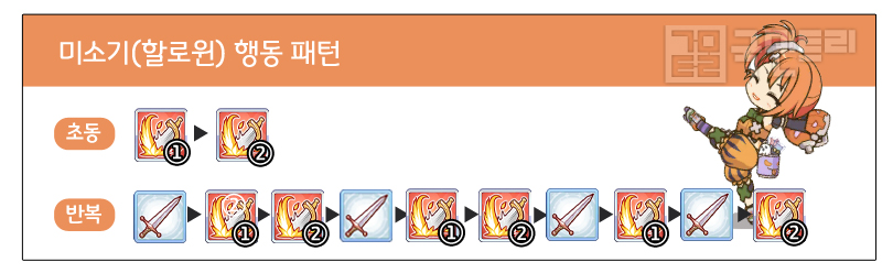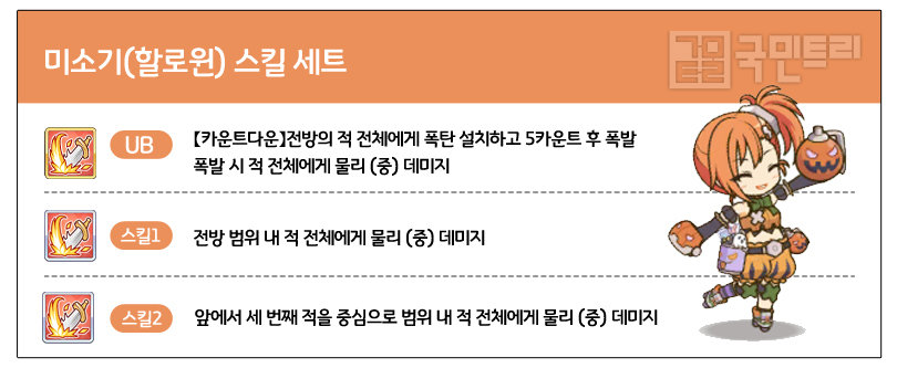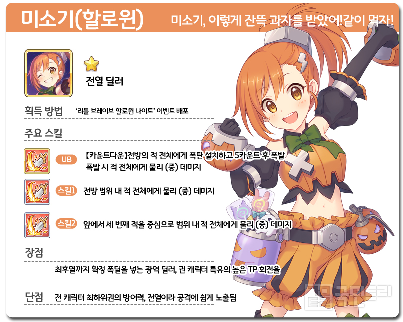 미소기(할로윈)은 이례적으로 모든 스킬이 광역기인 캐릭터다. 1스킬은 전방 범위 내 모든 적을 공격하며, 2스킬은 앞에서 세 번째 적을 중심으로 공격한다. 행동 패턴 또한 스킬 사용 빈도가 무척 높은 편으로, 기본 공격보다 광역 딜을 더 많이 한다. 이렇게 보면 이상적인 범위 딜러 같지만, 전 캐릭터 최하위권의 방어력과 전위 딜러인 점이 소소한 아쉬움을 자아낸다.
