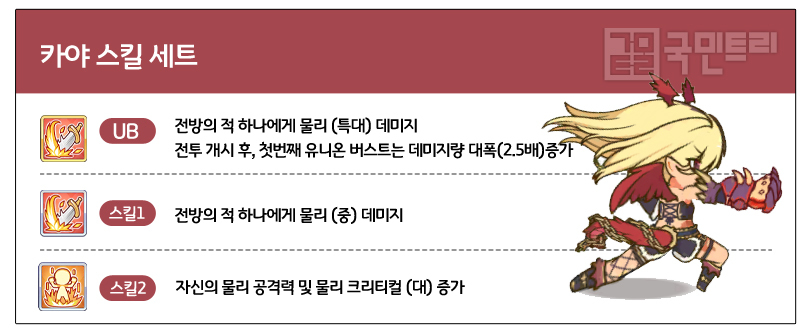 카야는 기존의 단일 물리 딜러와 비슷한 스킬 세트를 지녔다. 버프기를 통해 자신의 물리 공격력과 크리티컬을 크게 높이며, 1스킬을 사용해 적 1명에게 물리 대미지를 준다. 차별화 요소는 유니온 버스트와 행동 패턴으로, 7회의 초동 패턴 중 스킬을 6번 사용한다.