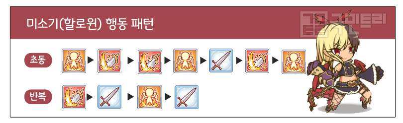 초동 패턴 종료 여부는 버프기 사용 횟수를 세면 파악할 수 있는데, 카야가 불길에 3번 휩싸이면 초동이 끝난 것이다. 반복 패턴도 짧고 간결하지만 효율적이다. 스킬과 기본 공격을 번갈아 사용한다.
