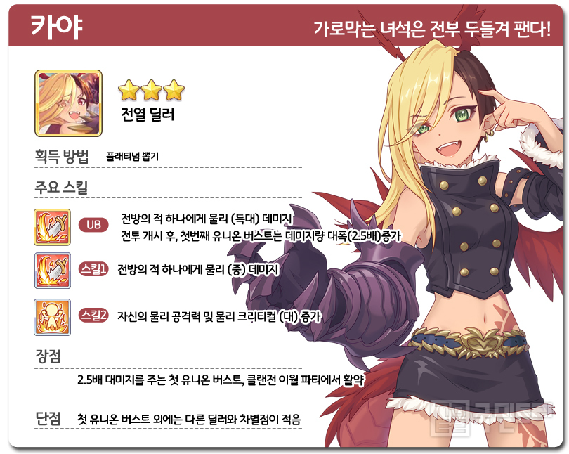15일, ‘프린세스 커넥트 Re:Dive(이하 프린세스 커넥트)’ 신규 캐릭터 업데이트를 진행했다. 지난 스토리 이벤트에서 등장한 ‘카야’가 플레이어 캐릭터로 등장했으며, 전투광 면모를 그대로 반영해 물리 딜러로 구현했다. ‘상남자’스러운 스킬 및 패턴 구성이 인상적인데, 기본 공격은 뒷전이고 버프기와 스킬을 난사하는 것은 기본. 유니온 버스트는 첫 발동 시 2.5배 딜을 넣는 ‘선빵 필승’을 보여준다.