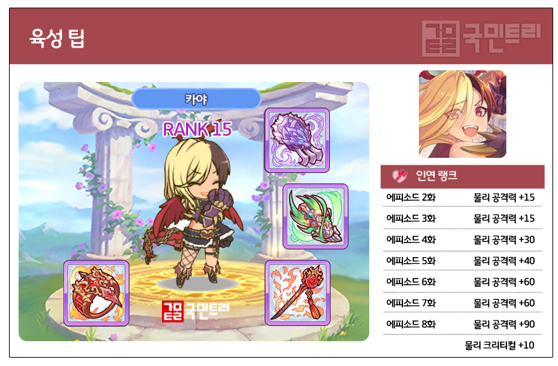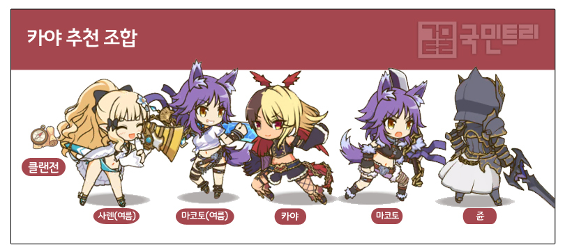 카야는 15랭크 4 장비를 추천한다. 함께 진행한 업데이트에서 신규 지역이 등장해, 네 번째 장비를 파밍 가능해졌다. 물리 크리티컬과 명중 스탯을 높여주니 첫 유니온 버스트를 최대한 강하게 맞혀야하는 카야에게는 필수다. 재능개화는 5성까지 진행하자. 상남자스러운 소녀인 만큼, 극딜이 가능하도록 힘을 보태면 된다.