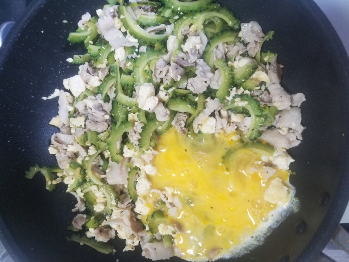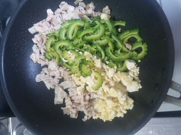 어느정도 색이 나면 아까 볶아둔 여주와 두부를 재투입합니다