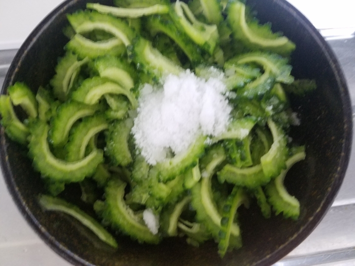 그러고 나면 이걸 소금물에 담궈줄건데 이렇게하면 여주 특유의 향이나 쓴 맛이 상당부분 날아가고 식감도 좋아져서 오래 담궈둘수록 좋습니다