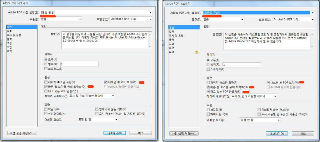 ***비교 : "고품질 인쇄"와 "출판 품질"의 차이점은 "색상을 그대로 유지"와 "cmyk"로 변환의 차이가 있습니다.
