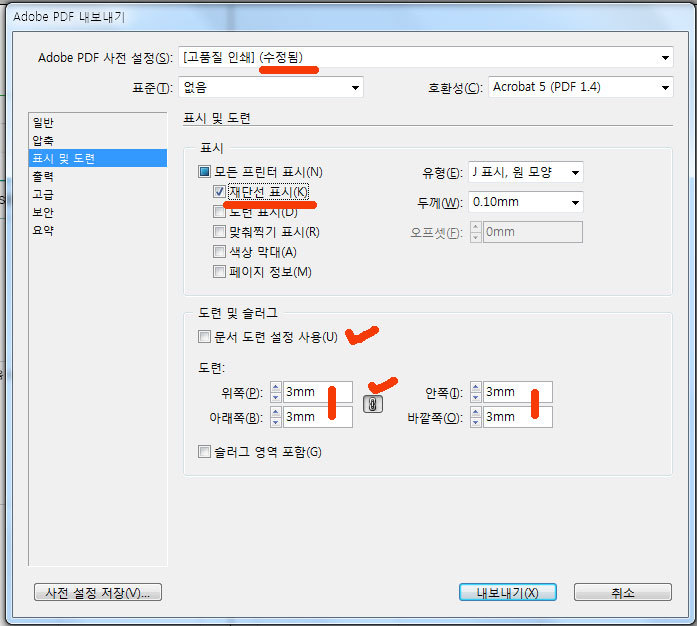 기본적으로 디지털 인쇄 및 별색 인쇄 등을 할 때에는 "고품질 인쇄"로 설정합니다. 4색 옵셋인쇄를 할 때에는 "출판 품질"로 설정합니다. PDF로 내보낼 때 옵션을 변경하면 사전 설정 이름 끝에 “수정됨”이 표시됩니다.