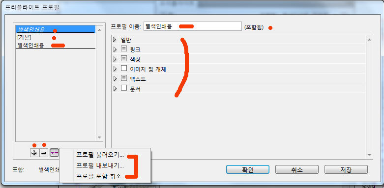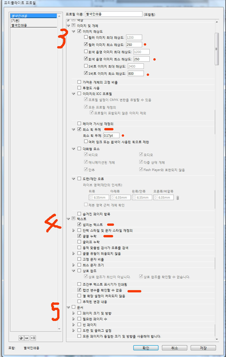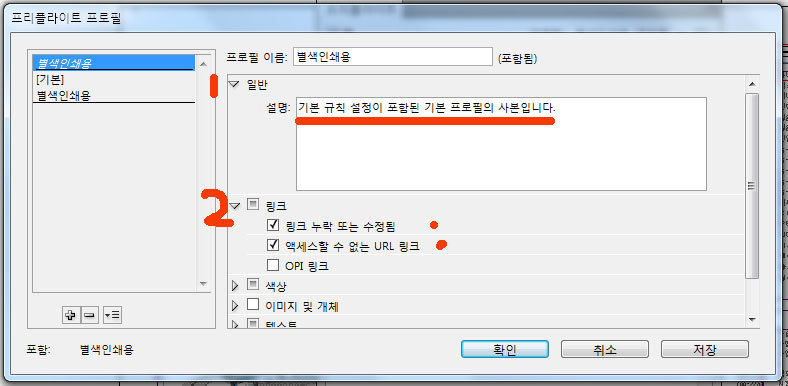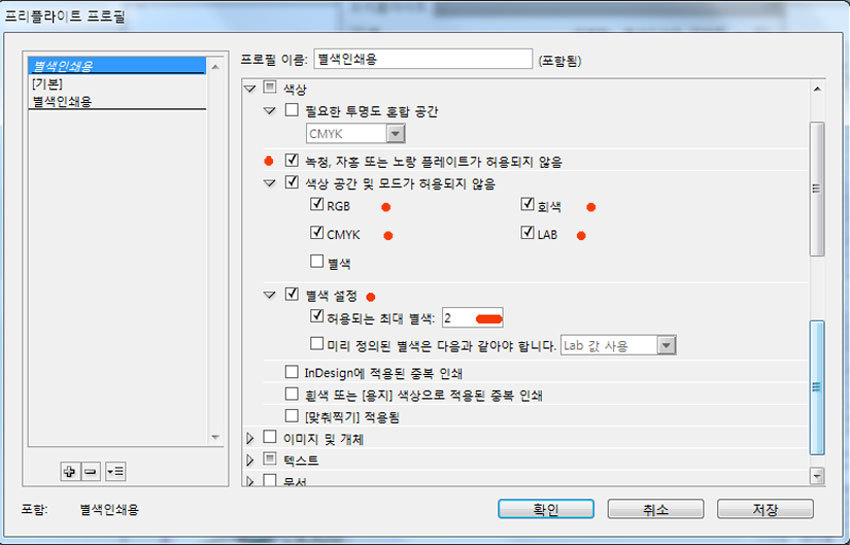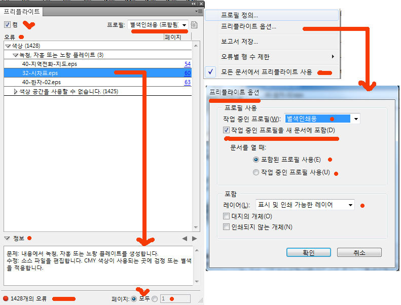 프리플라이트(Preflight) : 문서를 서비스 공급업체에 전달하거나 인쇄를 맡기기 전에 문서의 품질을 검사해 볼 수 있습니다. 프리플라이트는 이러한 과정을 일컫는 업계 표준 용어입니다. 실시간 프리플라이트를 활용하려면 초기 문서 만들기 단계에서 프리플라이트 프로필을 만들거나 지정하여, 프리플라이트가 켜진 경우 InDesign에서 문제를 감지하면 상태 표시줄에 빨간색 원형 아이콘이 나타납니다. 그러면 [프리플라이트] 패널을 열고 [정보] 섹션을 확인하여 기본적인 문제 해결 지침을 볼 수 있습니다. 프리플라이트를 꼭 사용하여야 하는 이유 : 색상 정보를 정확히 인식할 수 있습니다. 예를 들어 옵셑인쇄물에 RGB칼라가 들어가거나 고객으로 받은 데이터가 저해상도 이미지가 삽입되는 경우 설정을 미리 해 놓는다면 쉽게 보정할 수 있습니다. 또한 별색 작업을 하는데 CMYK, RGB 컬러가 텍스트, 이미지, 벡터파일 등 어느 곳엔가 숨어있는 것을 쉽게 찾을 수 있습니다. 보기 : 메뉴의 [창] [출력] [프리플라이트]를 클릭하시면 아래 그림과 같은 창이 나옵니다. 자주 사용할 수 있으므로 우측 옵션창에 포함시키면 편리합니다. 켬 : 프리플라이트를 실행합니다. 프로필 : 적용할 프로필을 선택합니다. 현재 작업에 관련한 프로필이 없으면 판넬 우측의 [역삼각형]을 누르면 위 그림과 같이 컨텍스트 메뉴에서 [프로필 정의]를 클릭하여 만들거나 가져옵니다. 오류, 페이지 : 오류를 나타내고 그 페이지를 표시합니다. 정보 : 상단의 오류를 클릭하면 하단의 정보에 문제점과 해결점을 제시해 줍니다. 완벽한 해결책은 없습니다. 총 오류 표지, 점검 페이지 지정 : 점검한 문서의 총 오류 갯수와 페이지 전부를 점검할 것인지 페이지를 지정할 수 있습니다. 프리플라이트 옵션 : [작업중인 프로필에 포함]을 체크하면 문서에 포함되어 다른 사람이 작업할 때 설정이 유지됩니다. 프로필 정의 : 프로필을 불러오거나 만들 때 사용합니다. 프로필을 추가할 때 하단의 [+]를 누릅니다. 제거할 때는 선택하고 [-]를 누릅니다. +, - 옆의 역삼각형을 누르면 [프로필 불러오기, 내보내기, 포함 취소]의 옵션이 있습니다. 다른 사람이 동일한 프로필을 사용하게 하기위하여 내보내기를 하여 저장합니다. 또는 초기화 되었을 때 불러오기를 하여 사용할 수 있습니다. 중앙에 [사전 점검 요소]들이 나열되어 있습니다. 중요한 부분이므로 각 요소별로 살펴봅니다. 1. 일반 : 아래 그림과 같이 기본 규칙이 적용되어 있습니다. 2번 링크에서 [링크 누락 또는 수정됨], [엑세스할 수 없는 링크]와 4번 텍스트에서 [넘치는 텍스트], [글꼴 누락], [캡션 변수를 확인할 수 없음]이 기본으로 선택되어 있습니다. 2. 링크 : 아래 그림은 기본으로 선택되어 있는 것입니다. 3. 색상 : 색상은 기본적으로 체크가 되어있지 않습니다. 사용자 정의에 따라 설정합니다. 본 도큐멘트의 출력의도는 [2도 별색]이므로 [cmy 플레이트 허용하지 않음]을 체크하여 링크된 파일에 대한 색상값을 체크합니다. 또한 [색상 공간 및 모드가 허용되지 않음]에서 [rgb, 회색, cmyk, lab]를 체크하여 방어합니다. 3. 이미지 및 개체 : 기본적으로 체크되어 있지 않습니다. 이미지의 품질을 위하여 최소 해상도를 설정해 놓으면 검증이 되어 안전성이 확보됩니다. 획은 출력에서 표현할 수 있는 한계가 실선 100%시 0.17point이며, 톤다운 시 최소 0.25point 이상이어야 합니다. 체크하여 안전성을 담보합니다. 4. 텍스트 : 기본적으로 체크되어 있는 정도를 사용합니다. 5. 문서 : 기본적으로 체크되어 있지 않습니다. 필요에 따라 설정합니다. *** 프리플라이트는 도큐멘트를 시작할 때에 설정하여 놓고 작업 중 점검하는 기능이 우선합니다. 작업이 완료된 후에는 처음 그림과 같이 너무 많은 에러들이 한꺼번에 리스팅되면 사용하는 의미가 없습니다. 그러한 경우 앞서 강의한 내용에 따라 수정을 해야합니다.