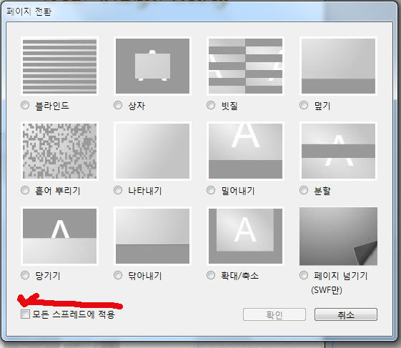 상기의 그림에서 선택을 클릭하면 아래와 같은 '페이지 전환' 옵션창이 뜹니다. 하단 왼쪽의 '모든 스프레드에 적용'의 사각 박스의 체크를 해제하여야 합니다. 체크를 하면 모든 스프레이에 적용하여져 부분으로 조정하는 의미가 없스니다.