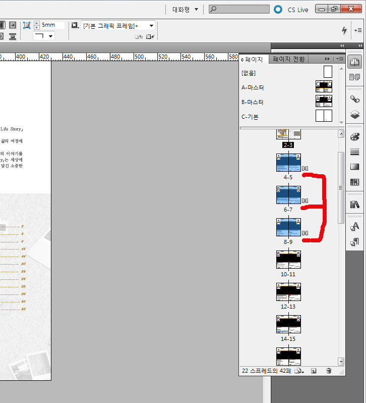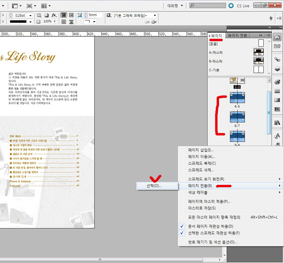 ** 실제는 상기와 같이 문서에서 직접 페이지마다 '페이지 넘김'을 설정하기 보다는 '내보내기 옵션'에서 일괄 적용하는 경우가 대부분입니다. '내보내기 옵션'은 따로 자세하게 다루겠습니다.