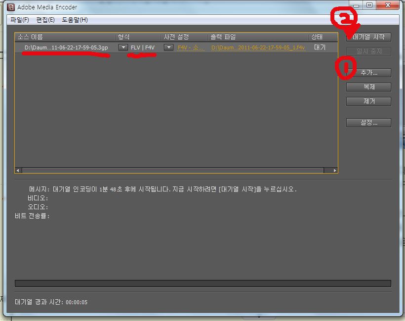 Adobe Media Encoder 실행합니다. 파일>추가하여 불러온 파일을 형식지정하고 '대기열 시작'을 클릭하면 FLV, F4V로 파일이 변환됩니다.
