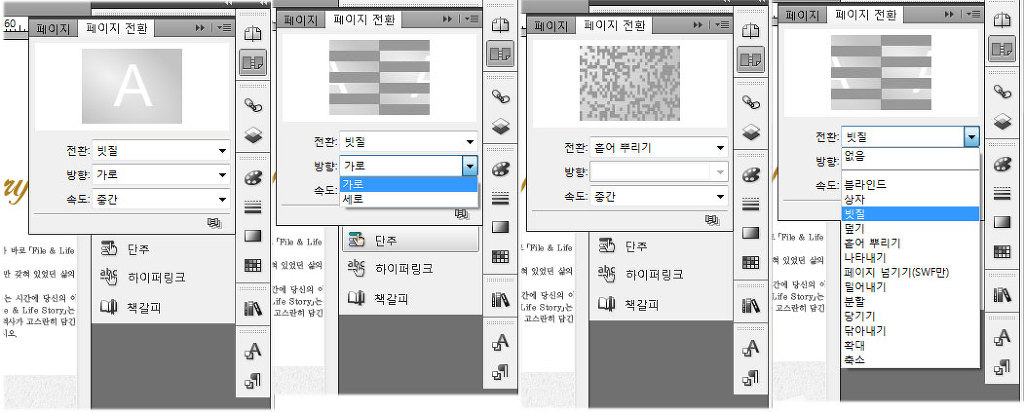 다음은 '페이지 전환 패널'에서 페이지 전환 옵션을 설정하는 창입니다. 이 곳에서 각각의 개별 설정에 대한 방향 및 속도 등을 조절할 수 있습니다.