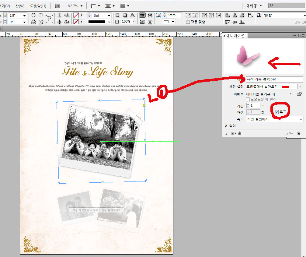 파일가져오기(Ctrol+D)를 하여 가져온 파일을 적당한 위치에 적당한 크기로 배치합니다. 옵션을 체크하고, 포스터 - 미리 보여줄 그림을 선택하니다. 컨트롤러를 선택합니다. 그리고 롤오버시 컨트롤러 표시를 하였습니다.