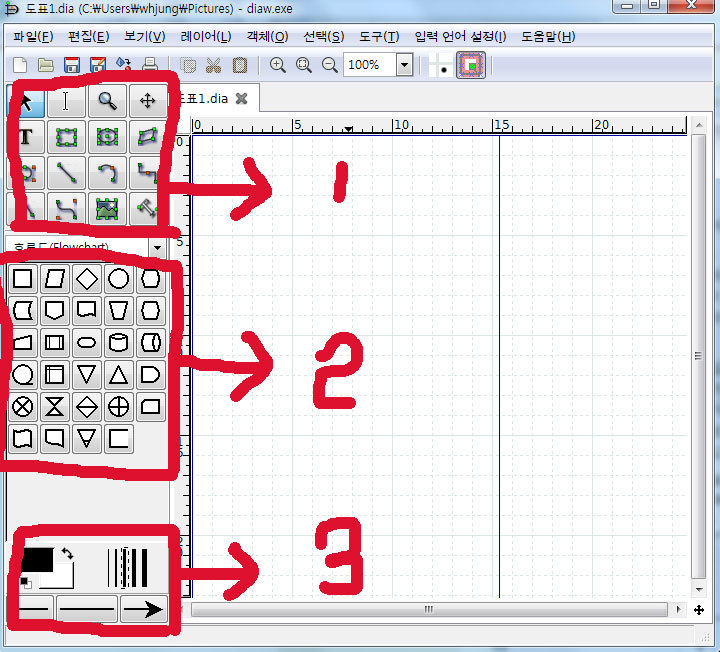 디아가 실행되면 오른쪽에 캔버스와 왼쪽에 도구상자가 배치되어있습니다. 도구 상자는 세 지역으로 나누어 져 있습니다. 상단 지역은 14 버튼이(아래 그림 1번) 포함되어 있습니다. 이 것은 다이어그램을 조정하는 데 사용되는 컨트롤입니다.