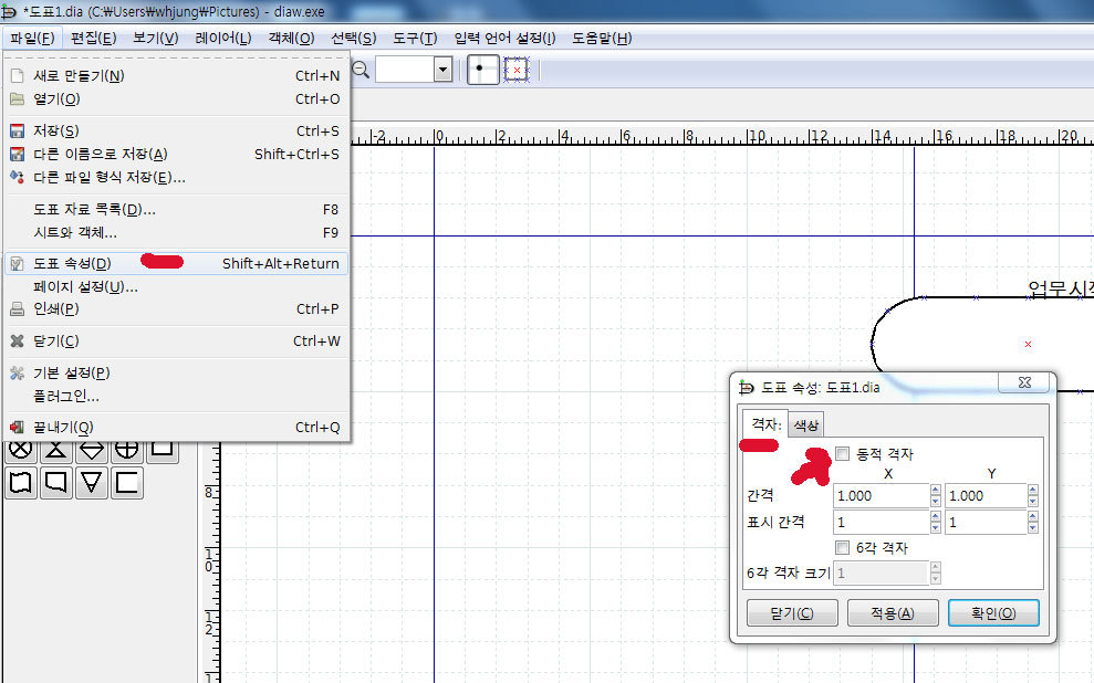 파일 > 도표 속성에서 격자에대한 설정을 할 수 있습니다.