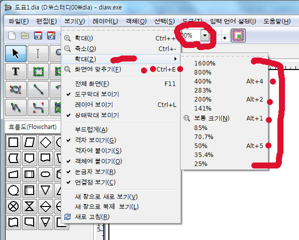 확대/축소는 자주 사용하는 기능이므로 약코드를 기억하는 것이 좋습니다. 특히 Ctrl+E는 작성한 순서도 전체를 볼 수 있는 기능입니다. 정확한 배율은 Alt+1,2,4,5를 각각 누르면 보통, 200%, 400%,50%로 확대/축소가 됩니다.