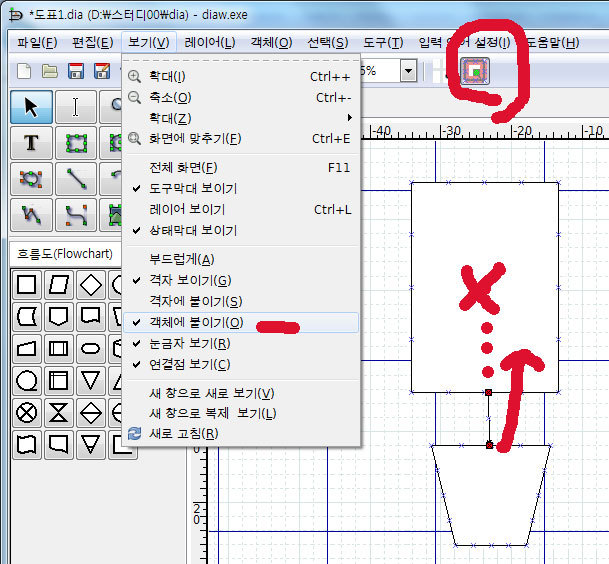 개체에 맞추기는 스냅 - 투 - 객체의 속성과 해제를 전환합니다. 이 켜져있을 때, 선은 객체 내부 지점으로 줄 끝 핸들을 드래그하여 객체의 중간 연결 지점에 연결 할 수 있습니다. 이 해제되면, 라인의 연결 핸들이 연결되는 객체의 중간 연결 지점으로 끌어내야합니다.