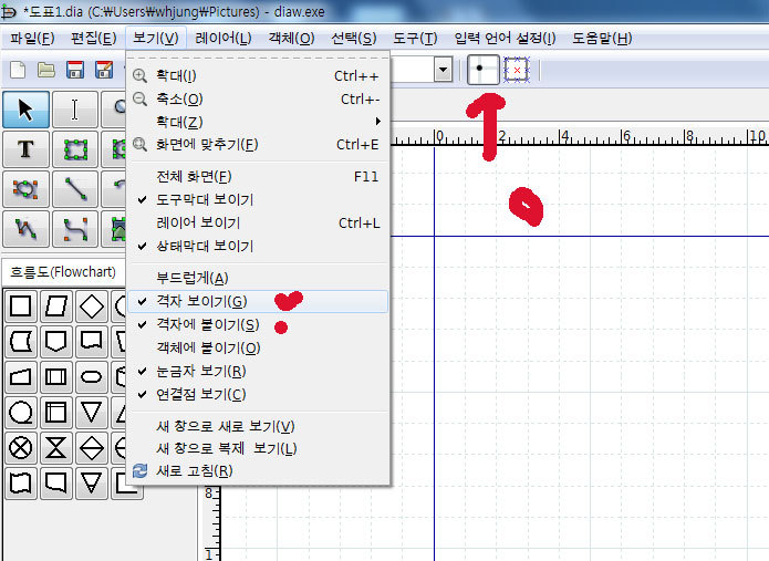 보기 > 격자 보이기를 체크하거나 해제함으로써 격자를 보이거나 보이지않게 할 수 있습니다. 또한 아래 그림과 같이 상단에 격자에 붙이기 스냅토글를 사용하여 격자에 붙이기를 사용할 수도 있습니다. 토글을 한 번 클릭할때마다 격자에 붙이기에서 해재로 바뀝니다.