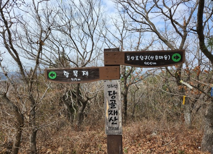 A코스 :산후마을 해오름 정자 → 등산로 입구 → 당골재산(235m) → 할묵재 →
