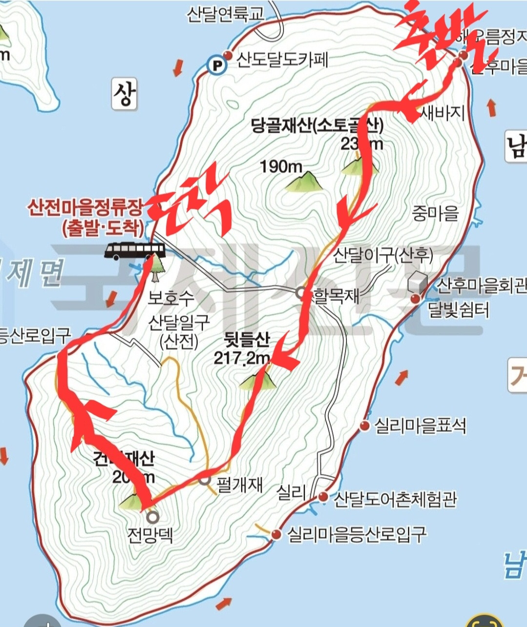 산전마을 등산로 입구 → 산전항 (거리는 6.3㎞, 3시간 예상)