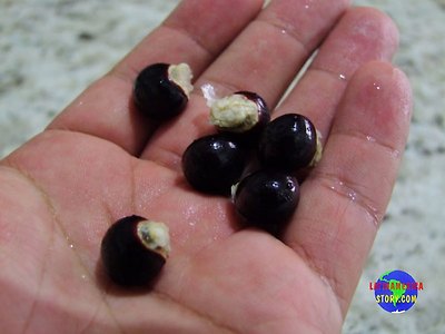 또 하나의 다른 점, 위의 두 과일과 다른 점은 새까만 씨 입니다. 위의 두 과일은 씨를 먹지는 않지만, 아무튼 그래도 단단하지는 않는데, 이 과일의 씨는 정말 단단합니다. 잘못하면 이가 상할 수 있습니다. 얼마나 동글동글하고 예뻐 보이는지 구슬치기하며 놀아도 되겠다는 생각이 듭니다. ㅎㅎㅎ;; 한 사이트에서는 이 씨를 갈아서 이뇨제로 쓴다고 하네요. 하지만 권해 드리지는 않겠습니다. 이거 말고도 손쉬운 이뇨제들이 얼마나 많은데, 이렇게 구하기 어려운 열대 과일 씨까지 먹겠습니까!