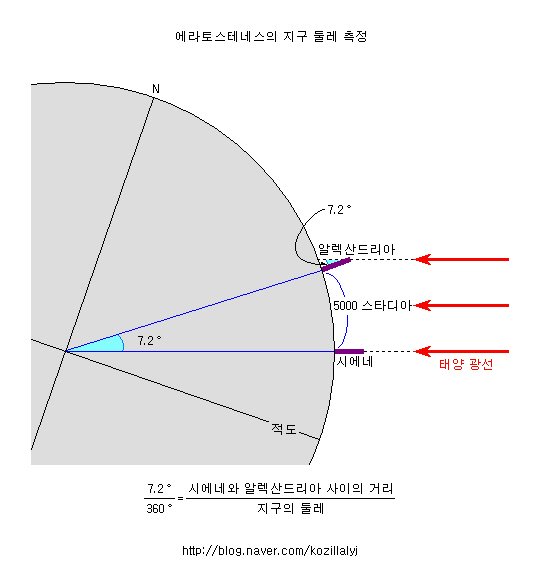 알렉산드리아에서 시에네 사이의 지구 중심각을 구하고 위의 그림과 같은