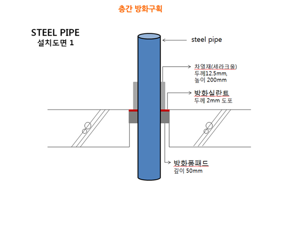 1). 화재발생시 아래층부분이 영상1000도씨 이상 5시간이상 경과되어도 위층(방화구획)으로 화염 이나 연소가스의 침입을 방지한다.