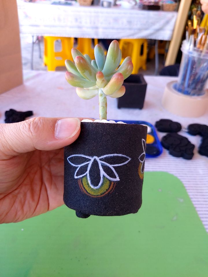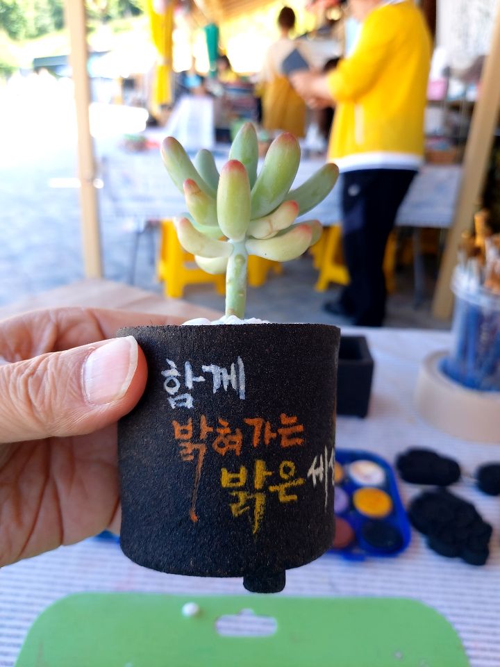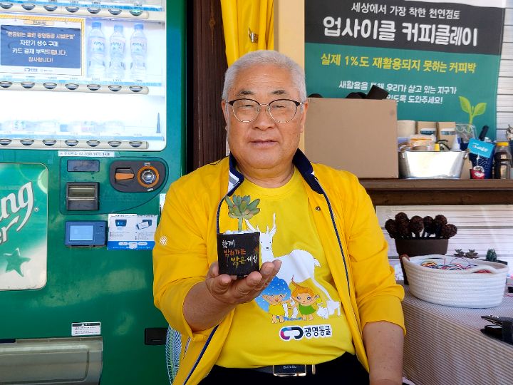 핑계김에 자리에 앉아 커피 찌꺼기로 만든 작은 화분에