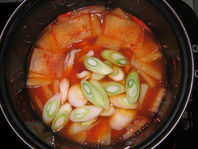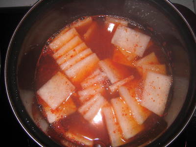 2.물에 고춧가루를 풀고 좀 끓이다가 무를 넣어요