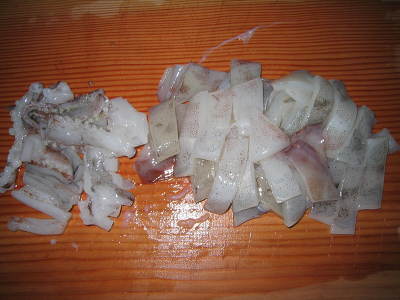 재료 : 오징어 한마리,파조금,무,고춧가루,물5컵정도,소금,다진마늘