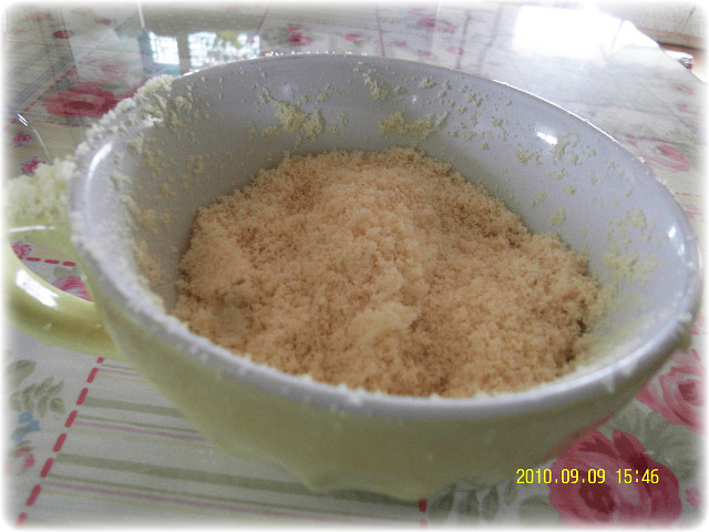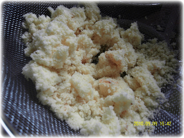 4.빵가루 만들기: 채에 카스테라빵의 위에 검은 부분을 걷어내고,곱게 갈아준다.(600원짜리 카스테라 2개)