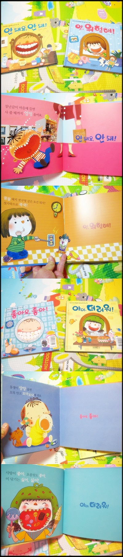 답댓글 작성자몽이맘~♥ 작성자 본인 여부 작성자 작성시간 11.01.26 한권에 반반 나누어져 잇어서 한쪽은 안돼요.안돼 책이구요.뒤쪽으로 뒤집으면 좋아요,좋아 책이 되는겁니다. 그래서 한권에 두가지 내용을 볼수 잇어요 ^^