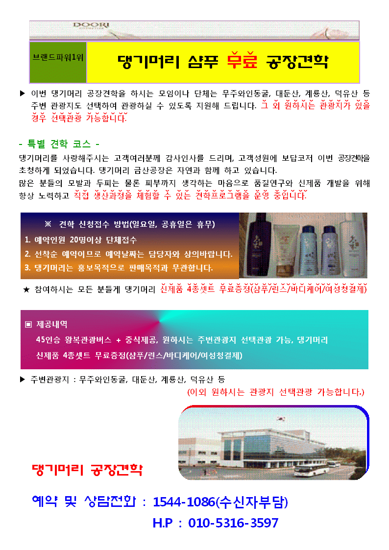 댕기머리샴푸 공장 견학에 여러분을 무료 초대합니다. 작성자댕기낭자|작성시간12.11.17|조회수47 목록 댓글 0 글자크기 작게가 글자크기 크게가 다음검색 현재 게시글 추가 기능 열기 북마크 공유하기 신고 센터로 신고 댓글 댓글 0 댓글쓰기 답글쓰기 댓글 리스트