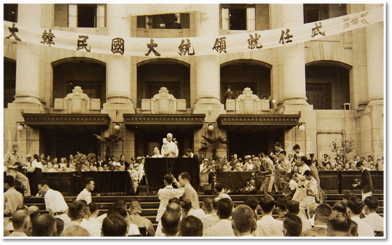 ▲ 대한민국 초대 대통령으로서 역사적인 취임사를 하고 있는 이승만 대통령<사진/국사편찬위원회>