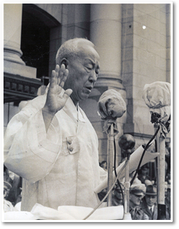▲ 특유의 개량 한복을 입고 취임선서를 하고 있는 초대 이승만 대통령