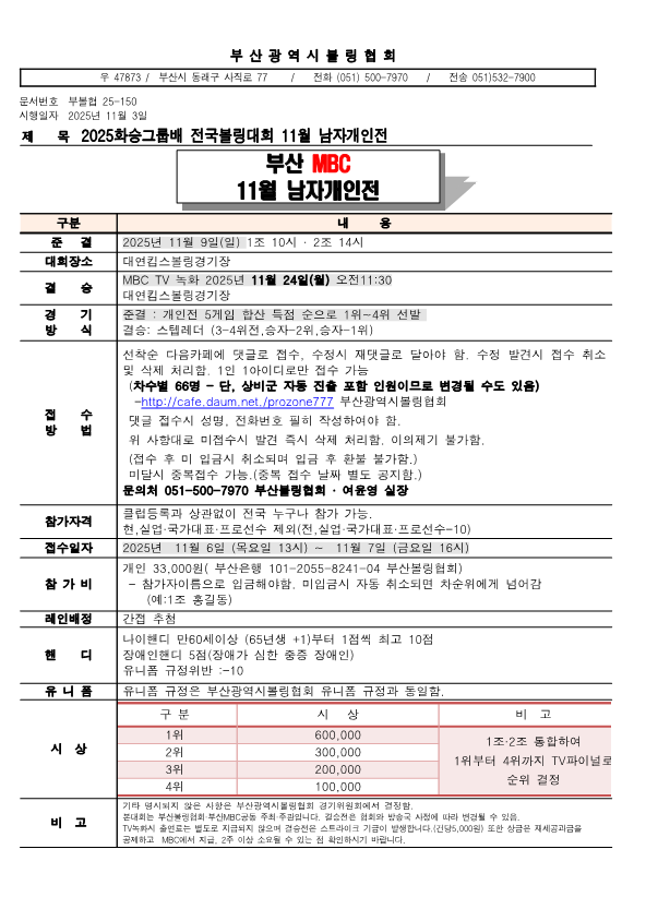 금번 11월 남자개인전 공지가 부산 전국체전으로 조금 늦은점 양해바랍니다.