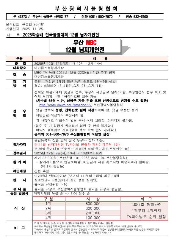 12월 남자개인전 대회요강 작성자여윤영/부산협회실장|작성시간25.11.25|조회수645 목록 댓글 0 글자크기 작게가 글자크기 크게가 안녕하세요.12월에 대회가 3개가 잡혀있습니다. 준결 날짜가 1주일 단위로 있고 접수도 1주일 단위로 이뤄지다보니 많이 복잡할 수 있습니다.대회요강 자세히 읽어보시고 참가신청 바랍니다. 다음검색 현재 게시글 추가 기능 열기 북마크 공유하기 신고 센터로 신고 댓글 댓글 0 댓글쓰기 답글쓰기 댓글 리스트