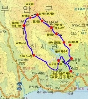 ◈ 산행 코스(A) : 운호마을~도심봉~비봉~삼신산(320m)~암릉지대~삼신산 갈마봉(486m)~바람재~삼거리분기봉~망포대(왕복)~헬기장~신선봉(488m)~돌탑봉~안부갈림길~운호마을(약 12.5km/약 5시간30분)