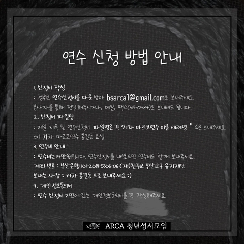 : 첨부된 연수신청서를 다운하신 다음 신청서를 빠짐없이 작성해주시고 bsarca1@gmail.com으로 보내주세요!