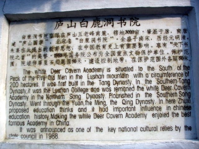 대략 백록동서원에 대해 기술하면 당시 송왕조는 문을 중시하고 무를 경시하는 숭문 정책을 실시하여 과거를 통해 인재를 양성하였고 학교기관은 과거 준비기관의 성격을 지니게 됨에 따라 유생들의 평소의 학업이나 인격 품덕에 대해서는 거의 고려하지 않았다. 그러므로 학교교육에 있어서도 유생들의 도덕교육에 대해서는 소홀히 하게 되었고 고시과목에만 치중하여 학교는 과거장으로 가는 통과문으로 되었으며 교육이란 과거의 예속물이 되고 말았다.이러한 과거의 폐단을 비판하며 출현하는것이 남송대 서원이다.따라서 남송대 교육사상 서원이 차지하는 비중은 매우 크다.