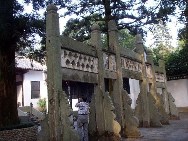 棂星门,始建于明成化三年(公元1466年),为南唐知府所建,明弘治十一年(公元1498年),南康知府苏葵重建。初为木结构,后南唐知府周祖尧建为石牌坊。它是白鹿洞书院现存最古老的建筑之一。古代传说“棂星”即“文星” ,以它命门,意即此处人才辈出,为国家培育栋梁之才之意。门为牌坊式,六柱五间,二层石梁连接。中梁刻有缠枝牡丹,石抱鼓扩柱病,饰海波纹,刀法粗犷简练。